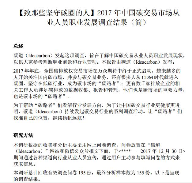 中國碳匯林訊  碳道團(tuán)隊對國內(nèi)碳圈行業(yè)進(jìn)行了2017年中國碳交易市場從業(yè)人員職業(yè)發(fā)展調(diào)查,現(xiàn)對調(diào)查結(jié)果公布如下。見附件。(中國碳匯林網(wǎng))