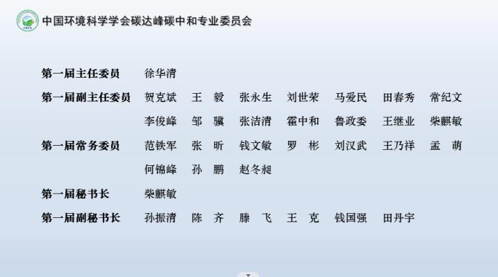 經投票表決,大會選舉產生了“雙碳專委會”第一屆委員,通過了主任委員、副主任委員、常務委員、秘書長、副秘書長名單。會議選舉國家氣候戰略中心主任徐華清任“雙碳專委會”主任委員,清華大學碳中和研究院院長賀克斌院士、中國科學院科技戰略咨詢研究院原副院長王毅、中國社會科學院生態文明研究所所長張永生、中國林業科學研究院原院長劉世榮、國家氣候戰略中心副主任馬愛民、生態環境部環境與經濟政策研究中心副主任田春秀、國務院發展研究中心資源與環境政策研究所副所長常紀文、紅杉碳中和研究院院長李俊峰、能源基金會首席執行官兼中國區總裁鄒驥、自然資源保護協會北京代表處首席代表張潔清、中節能碳達峰碳中和研究院院長霍中和、興業銀行首席經濟學家魯政委、國網數科控股公司總經理王繼業、國家氣候戰略中心戰略規劃部主任柴麒敏共14人任副主任委員。冶金工業規劃研究院院長范鐵軍、國家氣候戰略中心總經濟師張昕、云南省生態環境工程評估中心主任錢文敏、四川省環境政策研究與規劃院院長羅彬、碳排放權登記結算(武漢)有限責任公司執行總經理劉漢武、北京綠色交易所董事長王乃祥、廣州碳排放權交易中心總經理孟萌、四川聯合環境交易所董事長何錦峰、特斯聯科技集團副總裁孫鵬、中汽數據有限公司副總經理趙冬昶共10人當選常務委員。“雙碳專委會”秘書長由柴麒敏擔任,秘書處常設在國家氣候戰略中心。(本網)