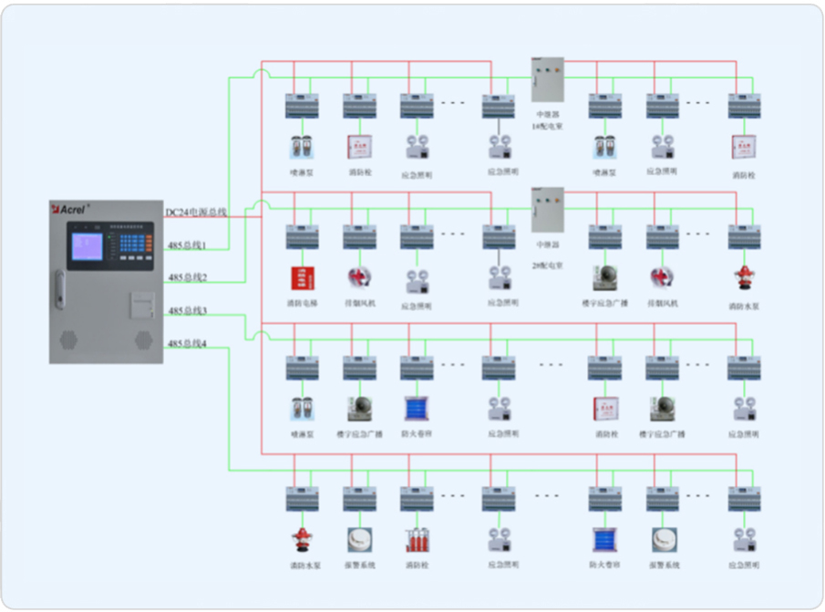 安科瑞電氣于2015年為該項(xiàng)目提供AFPM100小型消防設(shè)備電源監(jiān)控系統(tǒng)解決方案,該系統(tǒng)采用消防設(shè)備電源狀態(tài)監(jiān)控器+電壓/電流傳感器的兩層結(jié)構(gòu)組網(wǎng)模式,從而簡化了系統(tǒng)結(jié)構(gòu)設(shè)計(jì)。系統(tǒng)組網(wǎng)共分為站控管理層、網(wǎng)絡(luò)通訊層、現(xiàn)場設(shè)備層三層,該項(xiàng)目通訊總線共接入4條通訊總線,總線在樓層配電箱手拉手串接后,接入壁掛式后臺(tái),組成消防設(shè)備電源監(jiān)控系統(tǒng)的大動(dòng)脈。