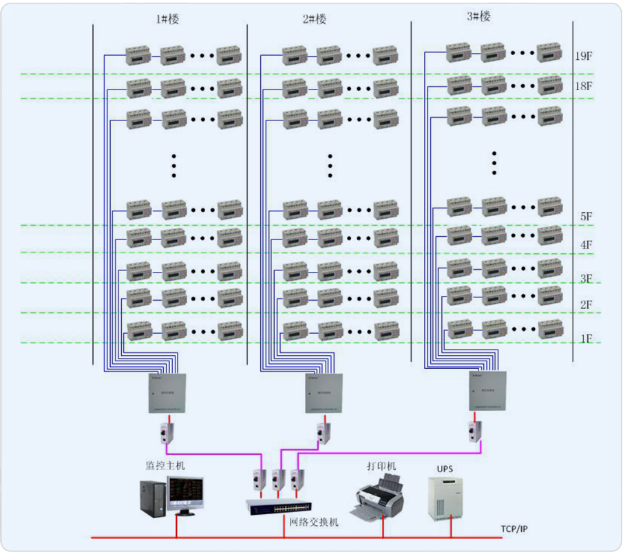 項目對黃金時代大廈各動力箱、照明箱等終端配電箱內各用電回路用電量進行電能管理,系統通過多功能的電能計量表計、通訊網絡和計算機軟件,實現各用電設備在運行過程中的實時數據采集、數據計算、數據統計、用電分析等,保證復雜供配電系統的安全可靠系數,實現故障快速響應;掌握大廈能源消耗的成本結構,確保節能計劃和措施順利實施;科學、智能管理,提高效率,降低損耗,實現經營成本優化。系統由站控管理層、網絡通訊層和現場設備層構成。系統要求盡量減少集中采集數據的裝置以保證系統的通訊可靠性。