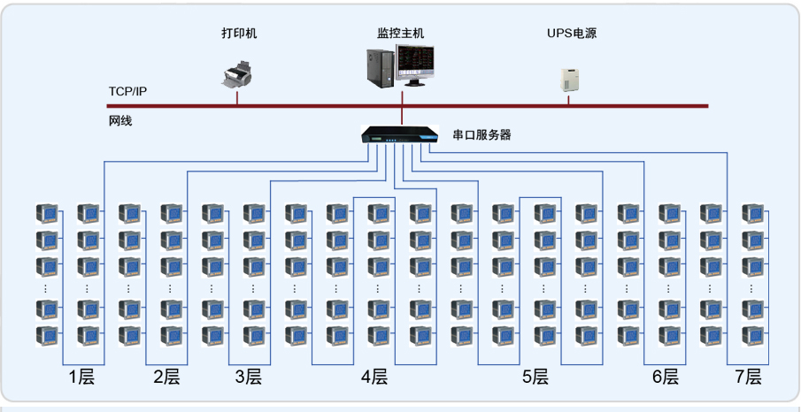 本項目電力監控系統采用分布式結構,為現場層、通訊層和后臺監控層。現場層指分布于于各樓層動力箱及地下配電室內的安科瑞系列儀表,通訊層包括NPORT5630-16串口服務器、網絡交換機等,后臺監控層包括計算機、打印 機、UPS電源等。通訊層及后臺監控層都位于地下監控室內。現場所有安科瑞系列儀表通過屏蔽雙絞線拉到地下監控室內,與串口服務器相連,經交換機與計算機連接,實現數據采集。