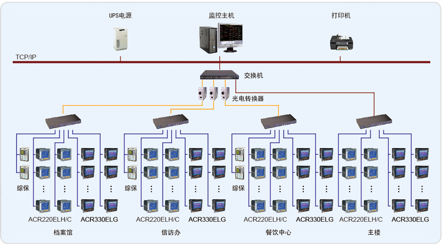 該項目采用Acrel-2000電力監控系統實現了海門行政中心4座樓內(主 樓、A樓、B樓、H樓)電力系統的智能管理。項目值班室位于主樓負一層變配電室內,主樓變配電室主要設備是:ACR220EL/KC、ACR330EL/KC可編程智能電測表共96塊,配置一臺工業網絡交換機;A樓變配電室主要設備是:ACR220EL/KC可編程智能電測表共63塊,現場采用8根總線,使用一臺8口的串口服務器,通過光纖連接至主樓值班室內的交換機上;B樓變配電室主要設備是:ACR220EL/KC可編程智能電測表共59塊,現場采用6根總線,使用一臺8口的串口服務器,通過光纖連接至主樓值班室內的交換機上;H樓變配電室主要設備是:ACR220EL/KC可編程智能電測表共105塊,采用5根總線,使用一臺8口的串口服務器,通過光纖連接至主樓值班室內的交換機上;再通過交換機把數據傳輸到工控機。上述設備均相互獨立完成各自的功能,不依賴主控計算機運行,具備RS-485 通信接口,通過現場的RS-485總線將檢測到的各項電參數和狀態信號實時傳輸到中間層的數據處理單元—串口服務器。