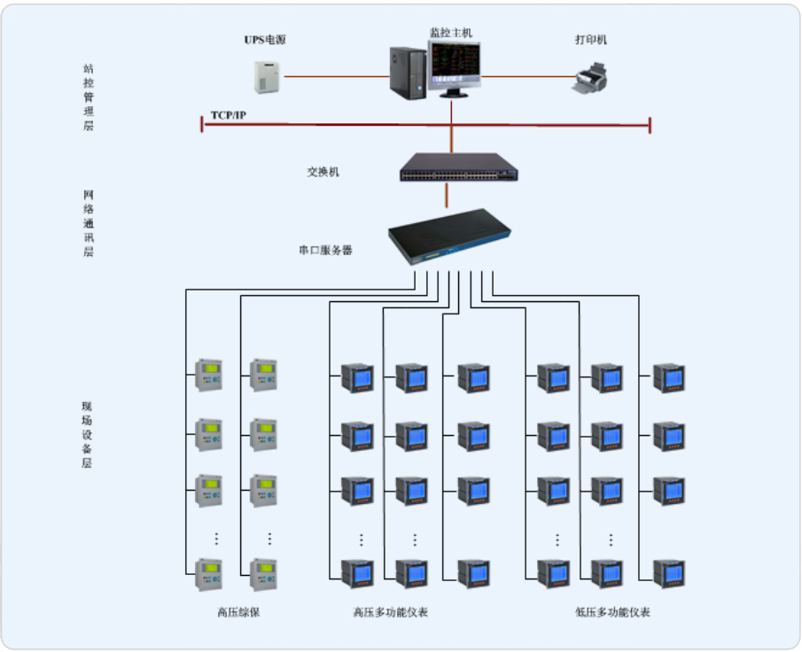 系統(tǒng)應(yīng)通過多功能的電力監(jiān)控裝置、通訊網(wǎng)絡(luò)和計(jì)算機(jī)軟件,實(shí)現(xiàn)醫(yī)院內(nèi)供配電系統(tǒng)在運(yùn)行過程中的數(shù)據(jù)采集、運(yùn)行監(jiān)視、事故預(yù)警、事故記錄和分析、電能質(zhì)量檢測、三相不平衡監(jiān)視、繼電保護(hù)等,完成醫(yī)院的安全供電、用電管理、設(shè)備管理和運(yùn)行管理。系統(tǒng)由主控層、通訊管理層和現(xiàn)場控制層構(gòu)成。系統(tǒng)要求盡量減少集中采集數(shù)據(jù)的裝置以保證系統(tǒng)的通訊可靠性。