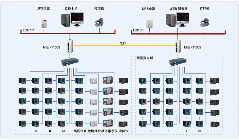 本監(jiān)控系統(tǒng)主要實現中科院蘇州醫(yī)工所的10/0.4kV配電系統(tǒng)進行用電監(jiān)測與電能管理;監(jiān)測范圍為一樓變電所的T3、T4變壓器進線柜,聯絡柜,溫控儀和二樓變電所的T1、T2變壓器進線柜,聯絡柜,溫控儀,高壓側儀表及綜保進行遠程實時監(jiān)控和電能管理。該系統(tǒng)總計有110只儀表(其中包括100只ACR220E,6只ABB,4只溫控儀),分7條總線,其中一樓變電所3條總線,二樓變電所4條總線,兩變電所都是直接通過屏蔽雙絞線走橋架拉至值班室連接到串口服務器,再通過網線連接至監(jiān)控主機實現總線上儀表與監(jiān)控主機的數據連通。