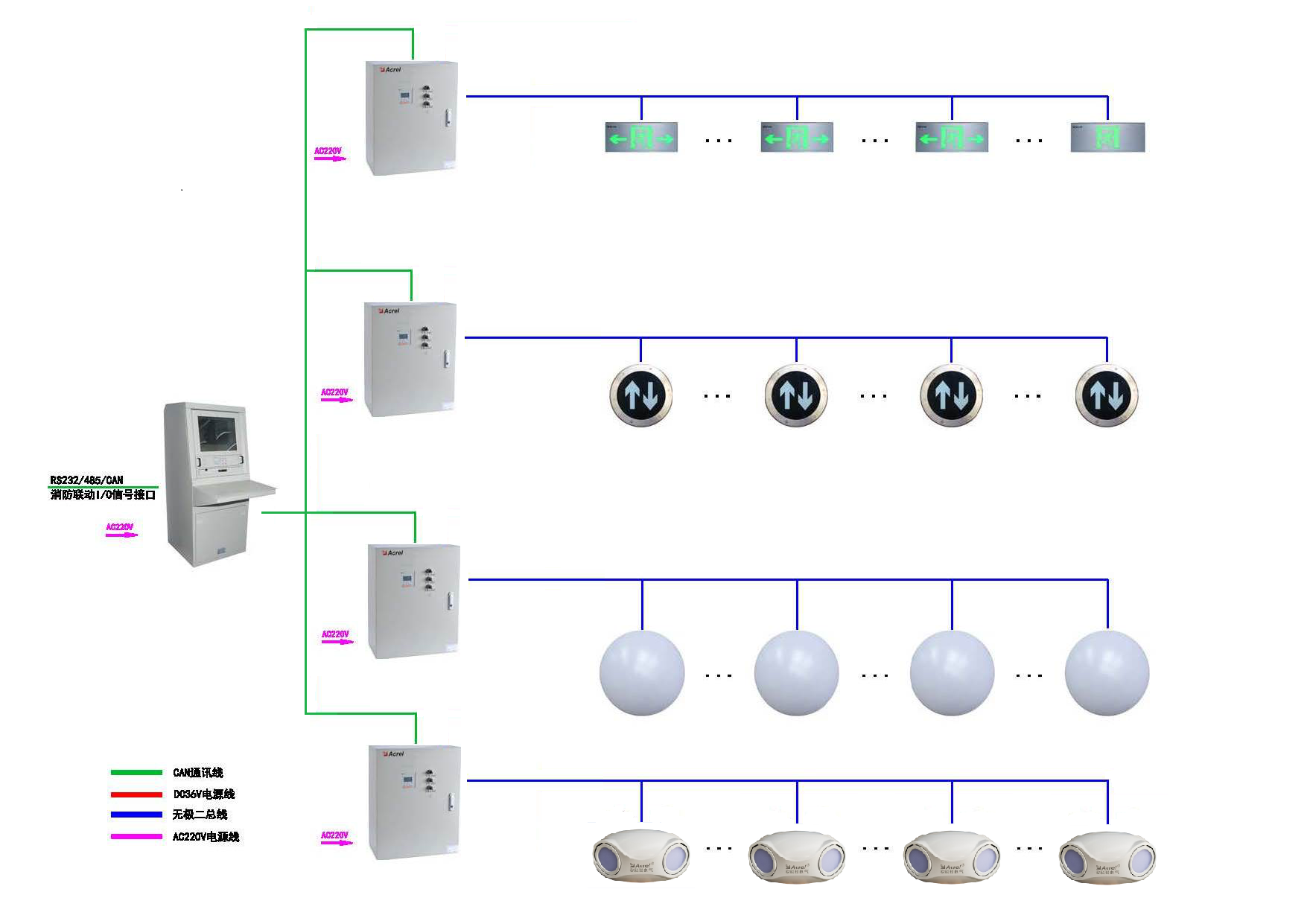 阿克蘇數(shù)據(jù)機(jī)房項(xiàng)目的消防應(yīng)急照明和疏散指示系統(tǒng)是安科瑞研發(fā)的集監(jiān)視、報(bào)警、管理于一體的計(jì)算機(jī)測(cè)控系統(tǒng),該系統(tǒng)可以通過控制器接收火災(zāi)報(bào)警系統(tǒng)的信號(hào),當(dāng)火災(zāi)發(fā)生的時(shí)候,消防應(yīng)急照明和疏散指示系統(tǒng)具有智能動(dòng)態(tài)導(dǎo)光功能,系統(tǒng)根據(jù)火災(zāi)報(bào)警聯(lián)動(dòng)信號(hào)及災(zāi)情現(xiàn)場(chǎng)的具體情況通過計(jì)算機(jī)選擇一條正確逃生路,再通過改變標(biāo)志燈的箭頭方向?yàn)樘由藛T提供更有效的疏散逃生路。當(dāng)發(fā)生緊急斷電或電源供電不足時(shí),應(yīng)急照明集中電源能夠給燈具供電,保證整個(gè)系統(tǒng)的正常工作。該系統(tǒng)由控制器、集中電源、消防應(yīng)急標(biāo)志燈具和消防應(yīng)急照明燈具等組成,系統(tǒng)結(jié)構(gòu)合理、功能強(qiáng)大、可靠性高、維護(hù)方便。