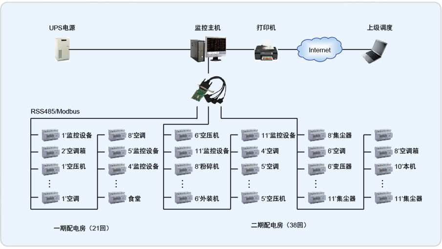 整個系統(tǒng)采用分布式結(jié)構(gòu),監(jiān)控主機(jī)位于東區(qū)主辦公室內(nèi),一期配電房和二期配電房采用RS485總線直接接入監(jiān)控主機(jī)擴(kuò)展卡的串口。對于每個回路采用ADL 300-EF/C三相電能表,共59個回路;站控層應(yīng)用國內(nèi)知名的聯(lián)想商用計(jì)算機(jī)作為監(jiān)控主機(jī),同時設(shè)有用于報表打印輸出的打印機(jī);防止異常斷電而引發(fā)的數(shù)據(jù)丟失的UPS設(shè)備。監(jiān)控軟件平臺采用單機(jī)版Acrel-2000型電力監(jiān)控系統(tǒng)。Acrel-2000型電力監(jiān)控系統(tǒng)預(yù)留了擴(kuò)展接口,可方便進(jìn)行擴(kuò)展。