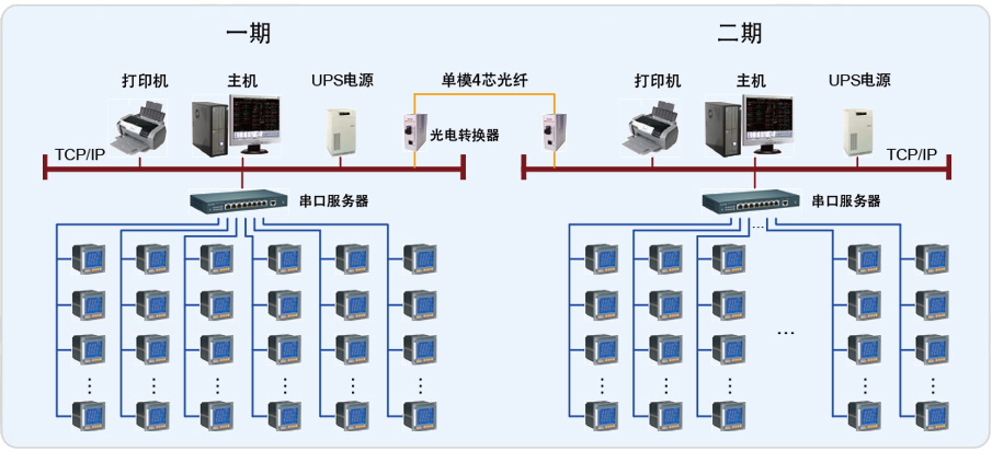 一期配電房由兩個相互獨立的配電房組成,動力中心配電房包含主室和次室,次室距主室的約30米。其中Acrel-2000電力監控系統在動力中心配電室的次室里。動力中心配電房有2臺變壓器(1#變壓器、2#變壓器),共有57臺ACR120EL;現場采用4根屏蔽雙絞總線連接。生產車間配電房中有2臺變壓器(3#變壓器、4#變壓器),共有39臺智能儀表,現場采用2根RS485總線上傳至主機。