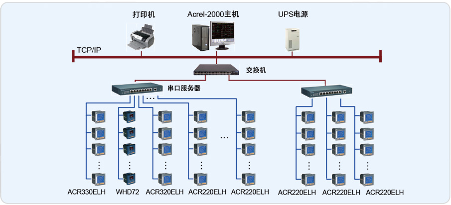 該院新建大樓系統(tǒng)分為配電室和樓層部分,配電室高壓部分采用ACR330ELH采集諧波數(shù)據(jù),WHD72采集溫濕度數(shù)據(jù);低壓進(jìn)線側(cè)采用ACR320ELH采集諧 波、功率因數(shù)等數(shù)據(jù), ACR220EK網(wǎng)絡(luò)電力儀表采集測量電流,開關(guān)狀態(tài)由輔助觸點接入ACR220EK儀表的DI(開關(guān)量輸入)接口。樓層部分由ACR220E采集電能數(shù)據(jù)。所有電參量數(shù)據(jù)由儀表的通訊接口經(jīng)RS-485總線傳給上位機,實現(xiàn)遙測、遙控和遙信功能。