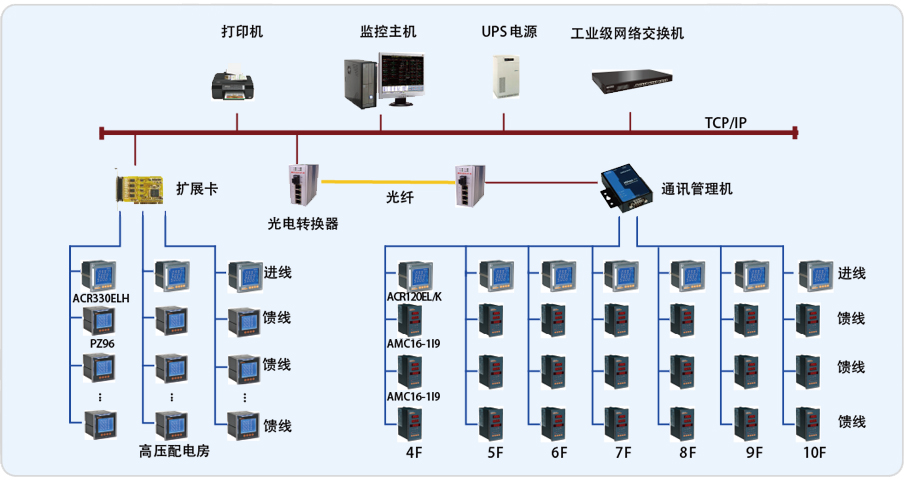 整個(gè)系統(tǒng)采用分布式結(jié)構(gòu),在上海東方電視臺(tái)變電所監(jiān)控室放置監(jiān)控主機(jī)及通訊采集裝置,現(xiàn)場(chǎng)各回路的儀表采用屏蔽雙絞線以總線型方式連接至通訊采集裝置,通訊管理機(jī)連接至交換機(jī),其中劇場(chǎng)中設(shè)備用光纖連接至監(jiān)控室。