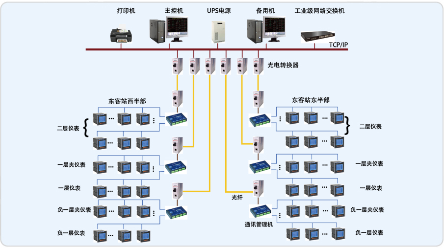 成都東客站電能管理系統(tǒng)采用雙機服務(wù),位于東客站一層西南角值班中心,同時該系統(tǒng)配有6臺管理機,根據(jù)現(xiàn)場儀表的分布范圍,合理的分配6臺管理機的管理范圍;為保障數(shù)據(jù)傳輸?shù)膶崟r性和穩(wěn)定性,均采用光纖進行數(shù)據(jù)上傳。在值班室對管理機上傳的數(shù)據(jù)進行多樣式表現(xiàn)方式,畫面比較形象直觀;系統(tǒng)同時具備向BA系統(tǒng)轉(zhuǎn)發(fā)數(shù)據(jù)的功能。