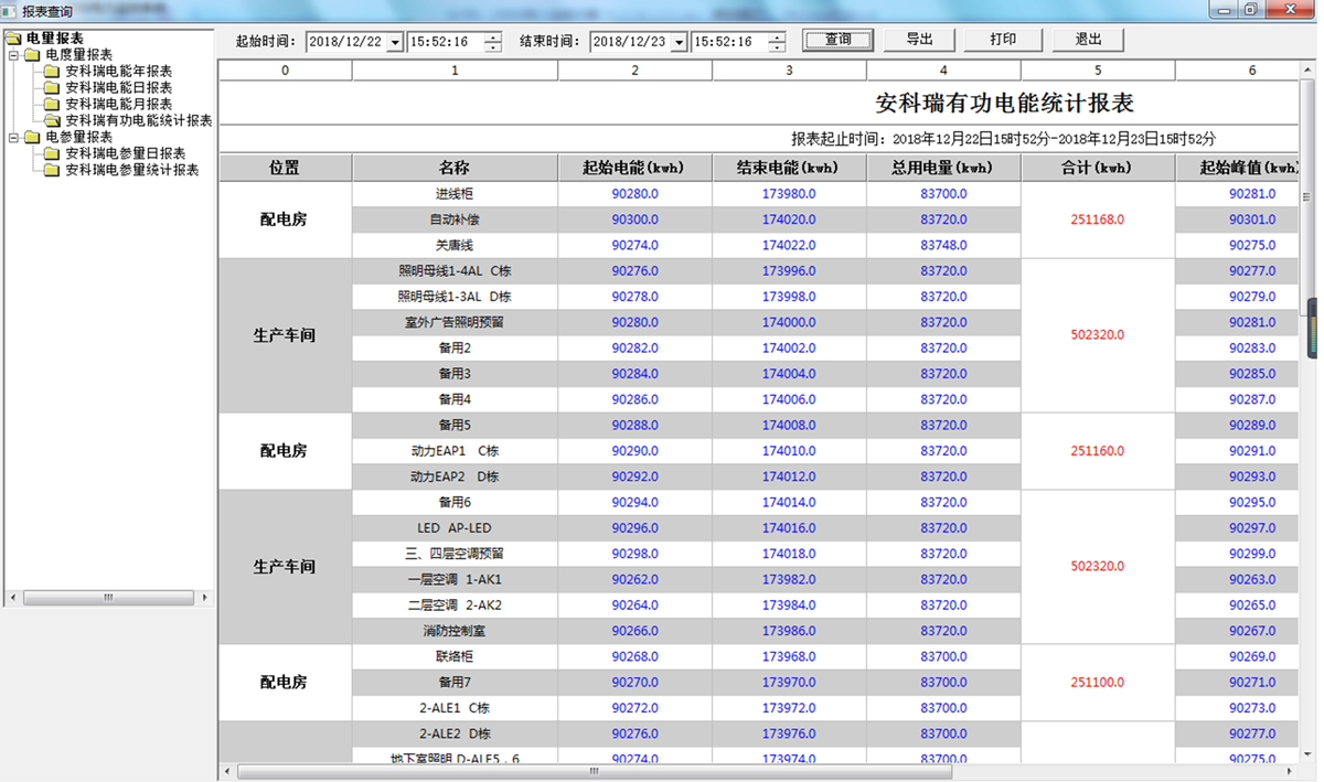 系統具備定時抄表匯總統計功能,用戶可以自由查詢自系統正常運行以來任意時間段內各配電節點的用電情況。