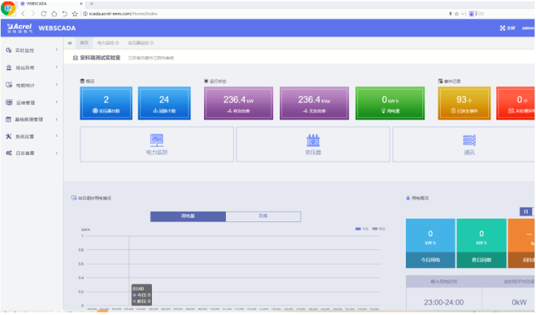 展示頁面顯示變電站數量、變壓器數量、監測點位數量等概況信息,設備通信狀態,用電分析和事件記錄。